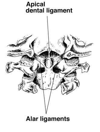 Occipital condyle fractures are important because they may be associated with instability of the occipitoatlantoaxial joint complex. The integrity of this complex articulation is dependent on a number of supporting ligaments, of which the tectorial membrane and bilateral alar ligaments are the most important. The tectorial membrane is a broad continuation of the posterior longitudinal ligament and is attached between the posterior body of C2 and the basiocciput *. Its main role is to limit extension at the occipitoatlantal joints. The bilateral alar ligaments are inelastic fan-shaped structures that extend from the posterolateral odontoid process to the inferomedial occipital condyles and lateral masses of C1 *. Bilateral alar ligaments limit lateral tilt and rotation in tandem. Fractures at the insertions of these ligaments are equivalent to intrinsic disruptions; occipital condyle fractures may therefore lead to instability of the craniocervical junction.