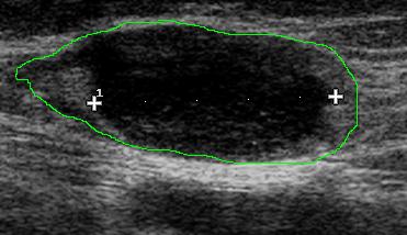 Az alsó képen körülrajzolt terület a teljes nyirokcsomó kontúrját jelöli; jól látszik az asszimetrikusan kiszélesedett, echoszegény köpenyzóna