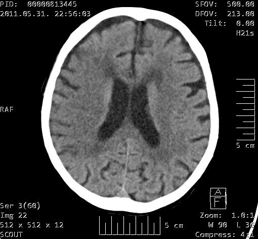 Ischaemiás stroke a jobb oldali a. cerebri media ellátási területén Szerző: admin | júl 6, 2011 | Brain | Nincsenek hozzászólások Az a. cerebri media területén az agyállomány hypodensebb az ellonoldalinál. Az intergyralis sulcusok keskenyebbek, a gyrusok kontúrja elmosott. A szürke és fehérállomány határa elmosott.