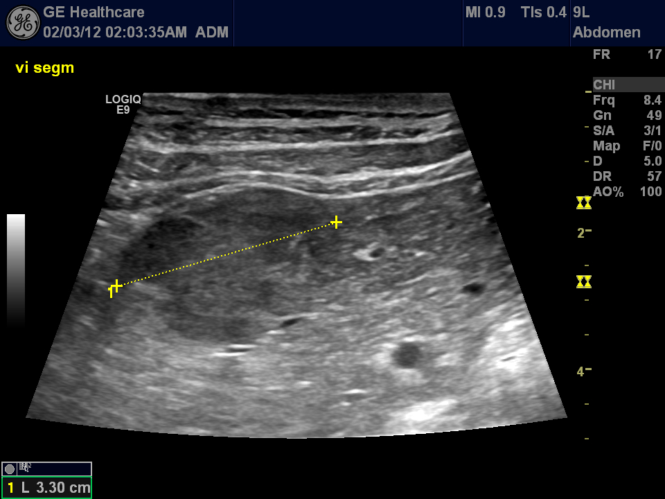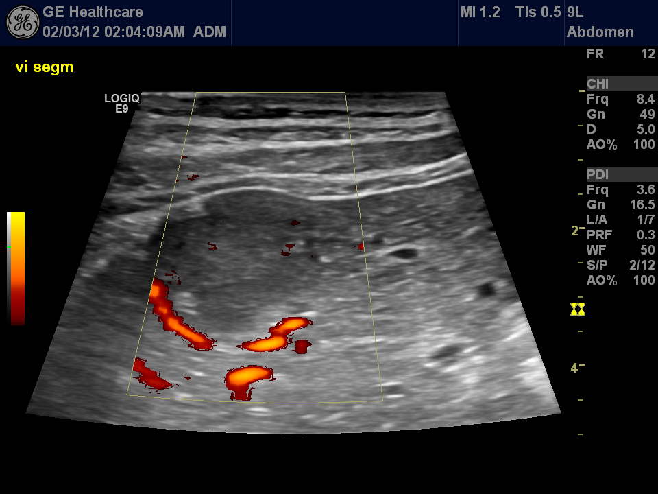 | Time-intensity-curves of to selected ROI (yellow – ring enhancement of the FLL, blue – normal liver parnchyma). Note the early enhancement of the metastases (time-to-peak). |