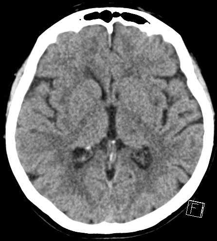 | ventrolateral left thalamic infarction related to the symptoms (appropriate windowing of the basal ganglia) |
