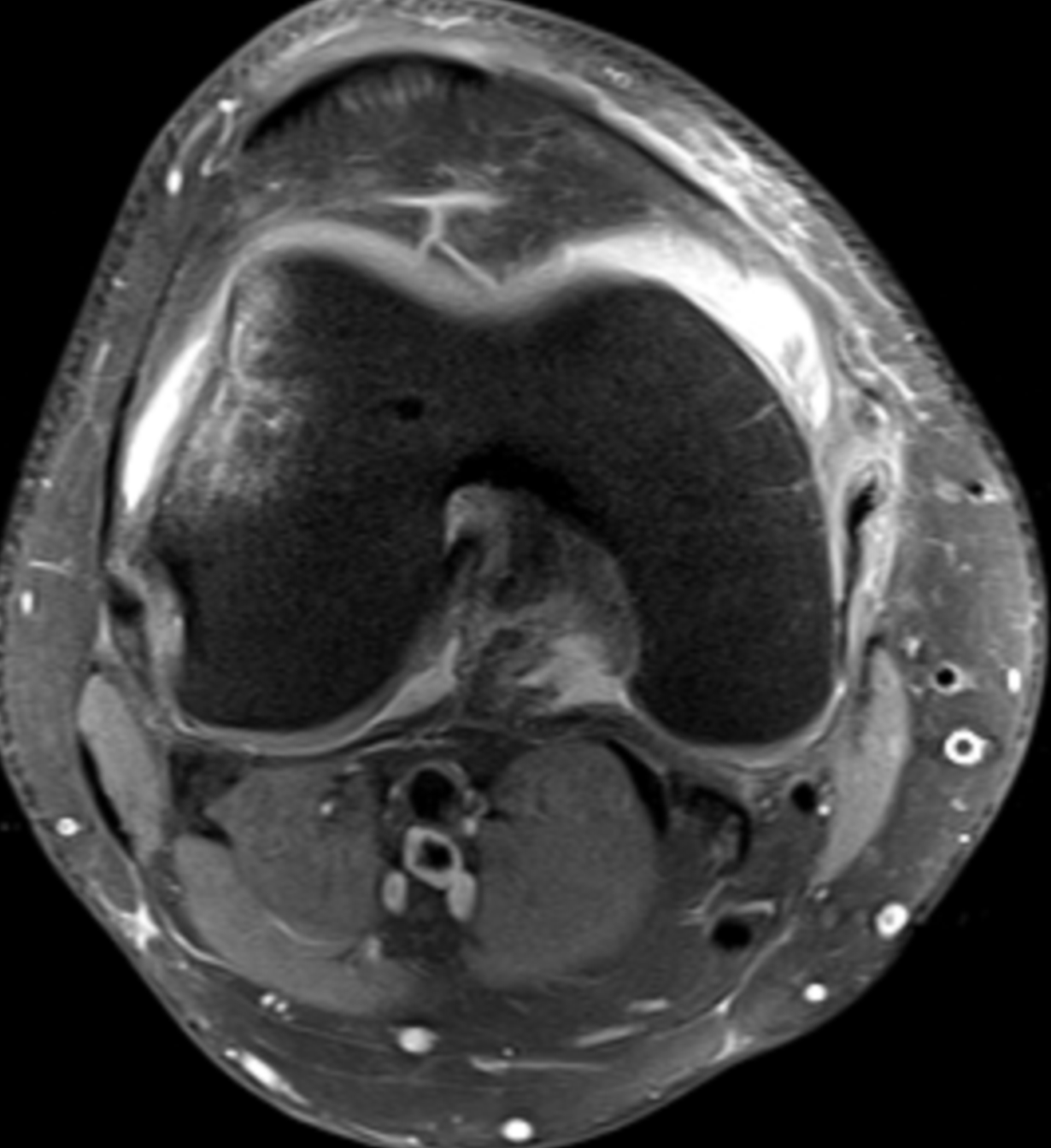 PD FS Axi: Grade IV chondral injury of the lateral aspect of the patellar articular surface is noted. Wiberg type III patella (markedly smaller medial patellar facet) is seen; predisposing factor for patellofemoral dislocation. Large amount of subsequent suprapatellar fluid collection.