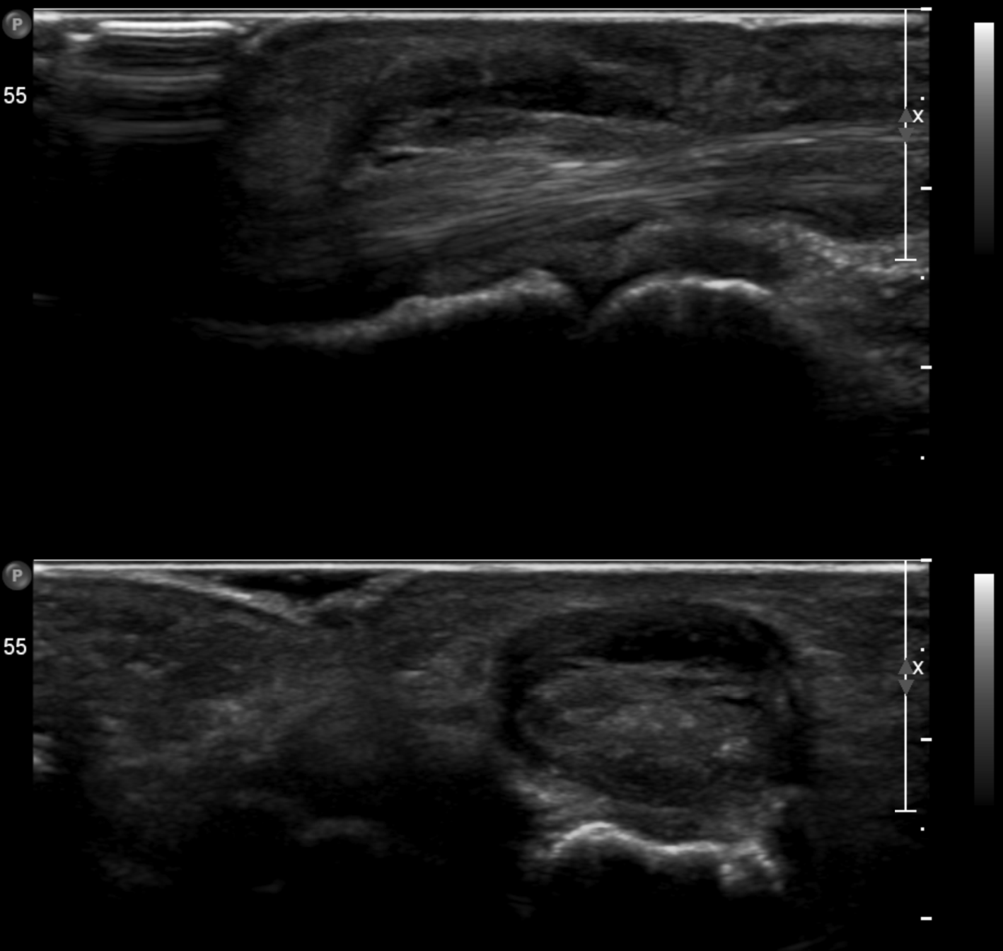 Trigger finger Szerző: admin | szept 4, 2015 | Ligamentous injury, MSK, Small joints | Nincsenek hozzászólások USS Sag & Axi at the level of the MCP joint: Gross thickening of the A1 pulley of fourth flexor tendon on the right without vascularity consistent with the trigger finger symptoms.